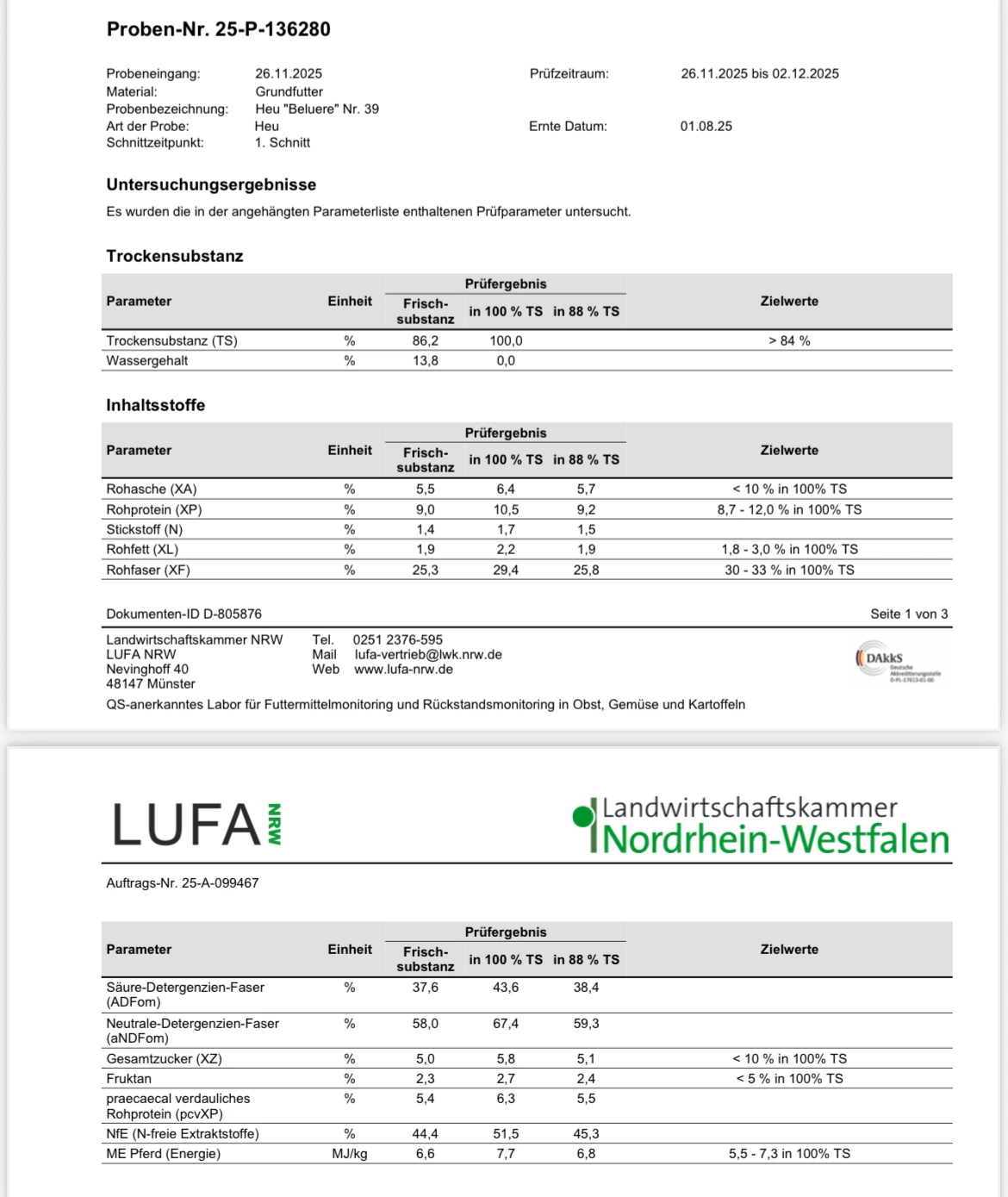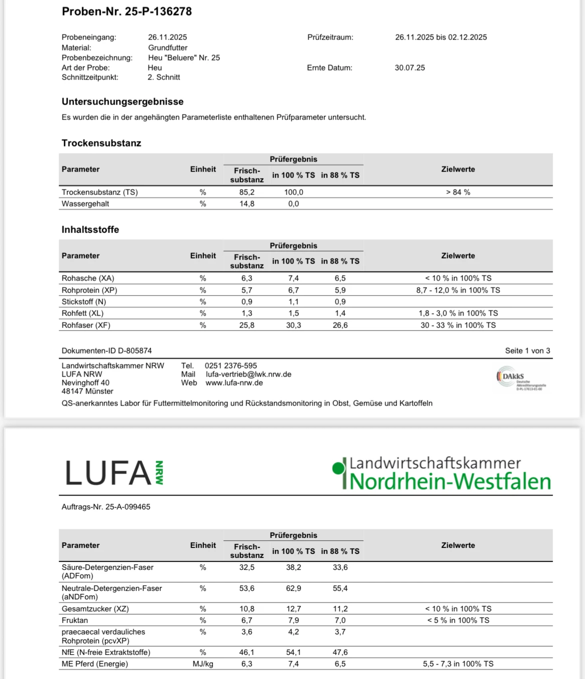 Die Kundenerfahrungen zeigen, dass unser Heu besonders gut verträglich ist und gesundheitsfördernd bei Pferden mit Stoffwechselproblemen (erhöhte Gammawerte, Hufrehe, Kotwasser) wirkt.